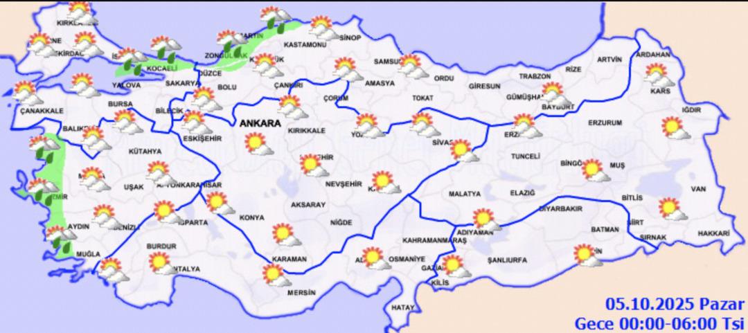 Meteoroloji Genel Müdürlüğü, hafta sonu için batı illerinde sağanak ve gök gürültülü sağanak yağış uyarısı yaptı. Ülkemizin batı kesimlerinde hava parçalı ve çok bulutlu olacak. Marmara (Bilecik hariç), Kıyı Ege, Batı Karadeniz (Sinop hariç), Manisa, Isparta, Antalya, Afyonkarahisar, Eskişehir, Çankırı, Ankara’nın kuzey ve batısı ile Burdur’un doğusu sağanak yağışlı geçecek. Diğer bölgelerde ise az bulutlu ve açık bir hava bekleniyor.