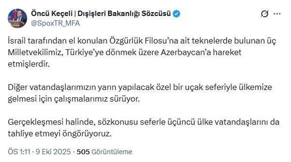 Dışişleri Bakanlığı Sözcüsü Öncü Keçeli, İsrail tarafından alıkonulan Özgürlük Filosu'na ait teknelerde bulunan Yeni Yol Partisi milletvekilleri Necmettin Çalışkan, Sema Silkin Ün ve Mehmet Atmaca'nın, Türkiye'ye dönmek üzere Azerbaycan'a hareket ettiklerini açıkladı. Keçeli, sosyal medya hesabından yaptığı açıklamada, "İsrail tarafından el konulan Özgürlük Filosu'na ait teknelerde bulunan üç milletvekilimiz, Türkiye'ye dönmek üzere Azerbaycan'a hareket etmişlerdir. Diğer vatandaşlarımızın yarın yapılacak özel bir uçak seferiyle ülkemize gelmesi için çalışmalarımız sürüyor. Gerçekleşmesi halinde, söz konusu seferle üçüncü ülke vatandaşlarını da tahliye etmeyi öngörüyoruz" dedi.