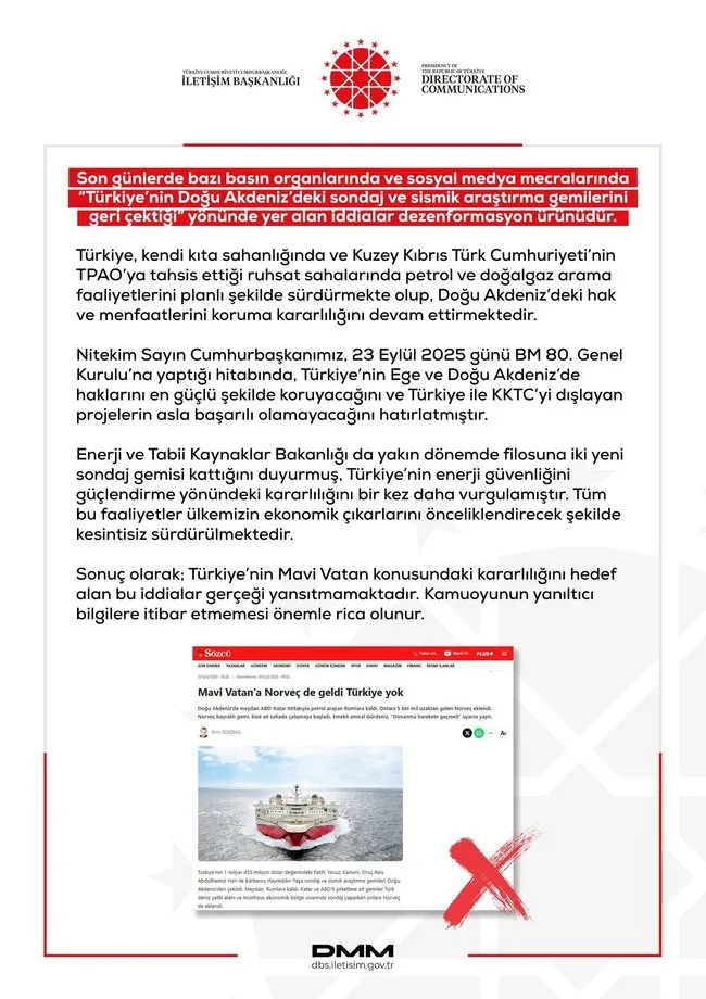 "Nitekim Sayın Cumhurbaşkanımız, 23 Eylül 2025 günü BM 80. Genel Kurulu'na yaptığı hitabında, Türkiye'nin Ege ve Doğu Akdeniz'de haklarını en güçlü şekilde koruyacağını ve Türkiye ile KKTC'yi dışlayan projelerin asla başarılı olamayacağını hatırlatmıştır. Enerji ve Tabii Kaynaklar Bakanlığı da yakın dönemde filosuna iki yeni sondaj gemisi kattığını duyurmuş, Türkiye'nin enerji güvenliğini güçlendirme yönündeki kararlılığını bir kez daha vurgulamıştır. Tüm bu faaliyetler ülkemizin ekonomik çıkarlarını önceliklendirecek şekilde kesintisiz sürdürülmektedir. Sonuç olarak Türkiye'nin 'Mavi Vatan' konusundaki kararlılığını hedef alan bu iddialar gerçeği yansıtmamaktadır. Kamuoyunun yanıltıcı bilgilere itibar etmemesi önemle rica olunur."