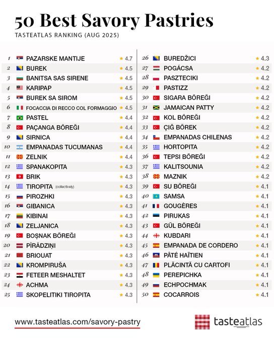 Yiyecek ve içecek kültürü listeleri ile bilinen TasteAtlas, Ağustos 2025 güncellemesiyle "En İyi 50 Tuzlu Hamur İşi" listesini açıkladı.