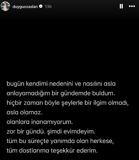 Özaslan, "Kendimi nedenini ve nasılını asla anlayamadığım bir gündemde buldum. Hiçbir zaman böyle şeylerle bir ilgim olmadı, asla olamaz. Olanlara inanamıyorum. Zor bir gündü. Şimdi evimdeyim. Tüm bu süreçte yanımda olan herkese, tüm dostlarıma teşekkür ederim." ifadelerini kullandı.