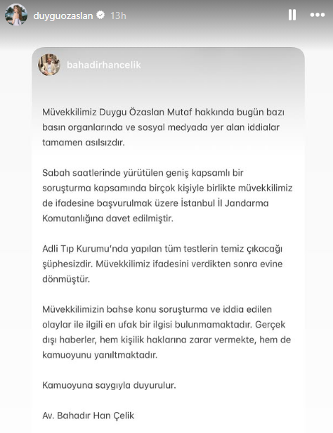 "Müvekkilimiz Duygu Özaslan Mutaf hakkında bugün bazı basın organlarında ve sosyal medyada yer alan iddialar tamamen asılsızdır.