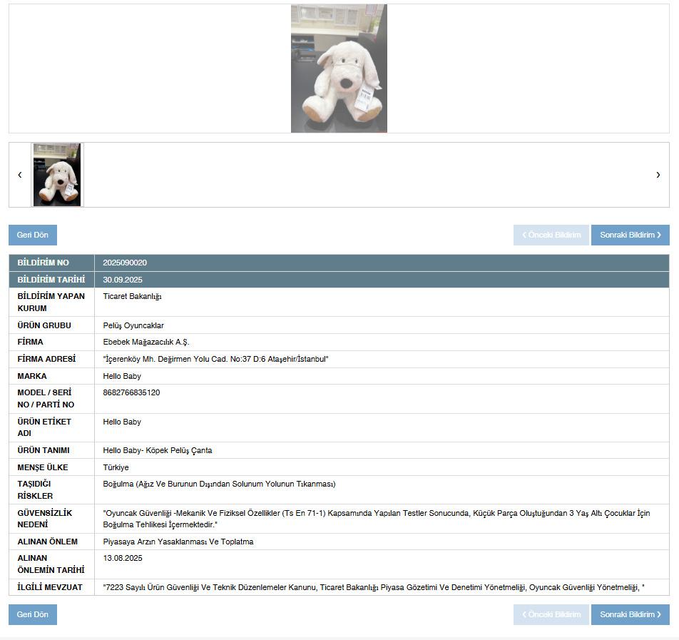 ebebek Mağazacılık A.Ş.’nin raflarında yer alan “Hello Baby” markalı köpek şeklindeki peluş oyuncak, güvenlik testlerinden geçemediği için Bakanlık tarafından “güvensiz” ilan edildi ve kara listeye alındı.