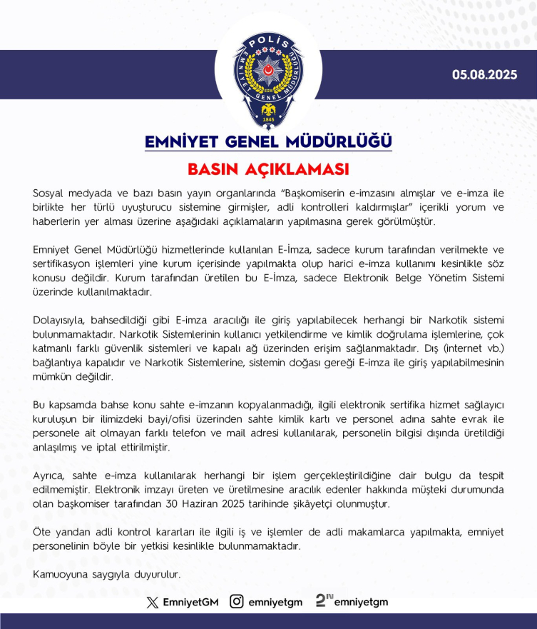Emniyet Genel Müdürlüğü (EGM), sosyal medyada ve bazı basın yayın organlarında yer alan "Başkomiserin e-imzasını almışlar ve e-imza ile birlikte her türlü uyuşturucu sistemine girmişler, adli kontrolleri kaldırmışlar" içerikli haberler üzerine açıklama yaptı.