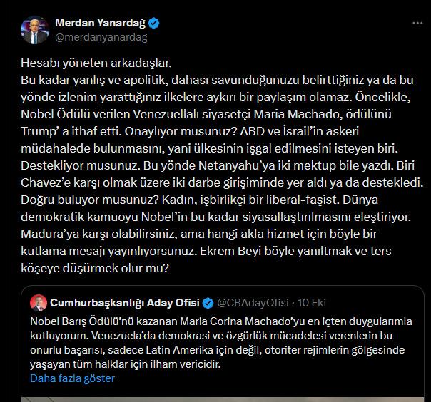 Bu kadar yanlış ve apolitik, dahası savunduğunuzu belirttiğiniz ya da bu yönde izlenim yarattığınız ilkelere aykırı bir paylaşım olamaz. Öncelikle, Nobel Ödülü verilen Venezuellalı siyasetçi Maria Machado, ödülünü Trump’ a ithaf etti. Onaylıyor musunuz?