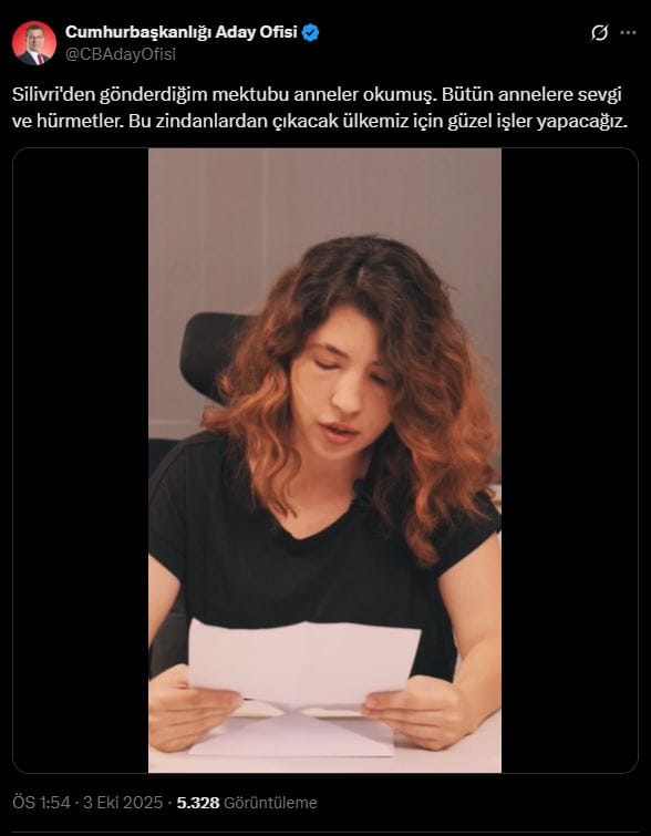 İmamoğlu'nun tüm annelere yazdığı o mektubu yine anneler sesli okudu. O anların videosunu Cumhurbaşkanlığı Aday Ofisi hesabından paylaşan Ekrem İmamoğlu, "Silivri'den gönderdiğim mektubu anneler okumuş. Bütün annelere sevgi ve hürmetler. Bu zindanlardan çıkacak ülkemiz için güzel işler yapacağız" dedi.