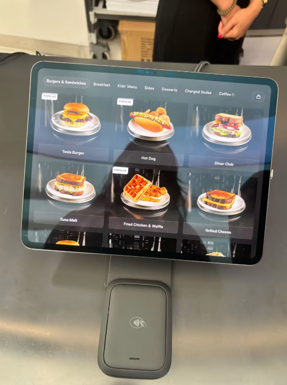 Menüde ise kızarmış tavuk ve waffle, ızgara peynirli sandviç, ton balıklı tost gibi klasik Amerikan lezzetlerinin yanı sıra "Elektrikli Soslu Tesla Burger" gibi temalı yemekler de yer aldı. Fiyatlar 4 ila 15 dolar arasında değişiyor.