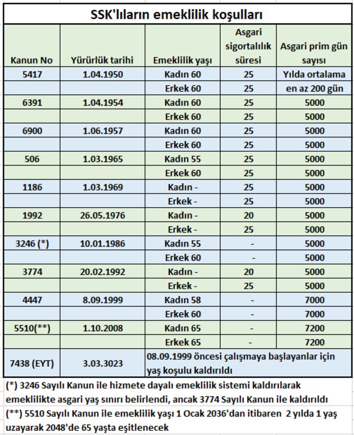 1999 yılında her ne kadar emeklilik yaşı kadınlarda 58, erkeklerde 60 olarak belirlenmiş ise de bu tarihten önce çalışmaya başlayanların emeklilik yaşı kademeli artırıldığı için fiili emeklilik yaşı daha düşüktü. EYT düzenlemesinden önce 2022 yılında SSK’dan yaşlılık aylığı bağlanan kadın ve erkeklerin ortalama yaşı 53 iken, EYT’nin yürürlüğe girdiği 2023 yılında erkeklerde 49’a, kadınlarda 48’e düştü. Kadın ve erkeklerin ortalama yaşı 4 yıl kısalarak 53’ten 49’a geriledi. SSK’lıların ortalama ilk emeklilik yaşı 2024 yılında da aynen devam etti.