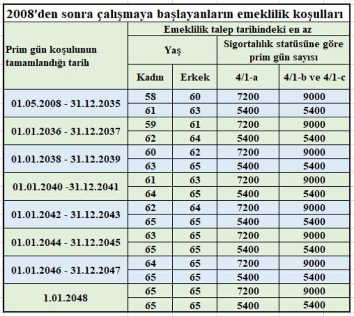 İlk defa çalışmaya 2008-2020 yılları arasında başlayan kadınlar 58 - 64 yaşları arasında, erkekler 60 - 64 yaşları arasında emekli olabilecekler.