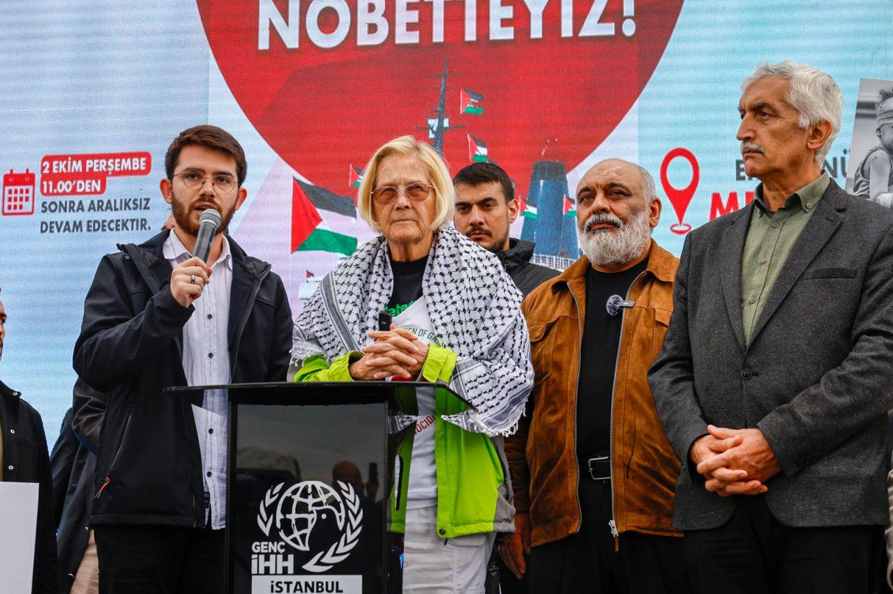 Amerikalı aktivist ve Özgürlük Filosu Sözcüsü Ann Wright da yaptığı konuşmada Özgürlük Filosu’na değinerek, “Filoya katılanlar arasında 20’nin üzerinde milletin vatandaşları var. Dünya milletleri İsrail’in Gazze ve Filistin’deki Müslümanlara yaptığı şeyler hakkında çok sinirli ve öfkeli. Tekneler yollarına devam ederken yeni teknelerin de onlara katılması bekleniyor. Filistinle olan dayanışmanızda İstanbullular gerçekten önemli işler başardınız. Özgür Filistin demek ve burada sizinle olmak çok değerli” dedi.