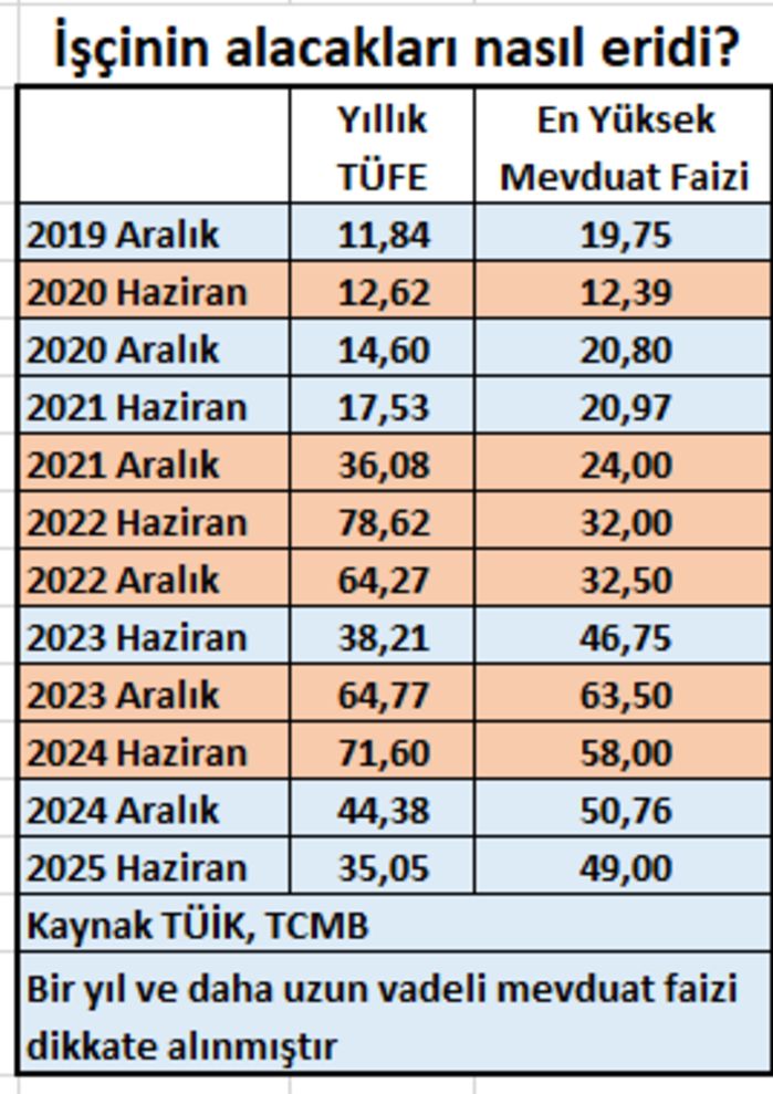 İşçi alacaklarında kanuni faiz yerine en yüksek mevduat faizinin uygulanması ilk başta olumlu görünüyor. Enflasyonun nispeten stabil olduğu dönemlerde mevduat faizi daha yüksek seyrettiği için kayıp olmuyor ancak son yıllardaki gibi enflasyonun yüksek seyrettiği dönemlerde mevduat faizi enflasyonun çok altında kaldığı için işçi alacakları adeta eridi.