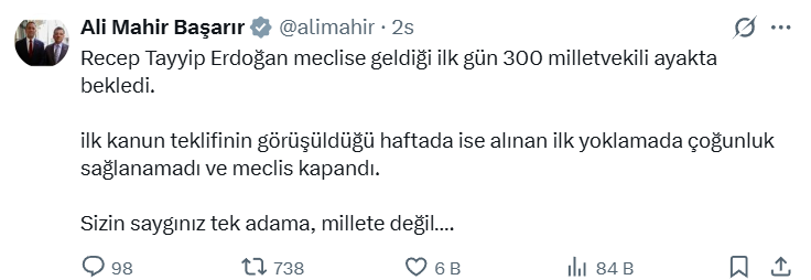 "SAYGINIZ TEK ADAMA"CHP Grup Başkanvekili Ali Mahir Başarır, sosyal medya hesabından yaptığı açıklamada, Meclis’in açıldığı gün 300 milletvekilinin Cumhurbaşkanı Erdoğan’ı ayakta karşıladığını hatırlatarak şunları yazdı: