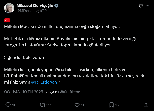 İYİ Parti Genel Başkanı Müsavat Dervişoğlu SDG ile ABD Büyükelçisi Tom Barrack'ın bir arada fotoğrafı ve TBMM'de Öcalan sloganları ile ilgili Cumhurbaşkanı ve AKP Genel Başkanı Erdoğan'a çağrıda bulundu.