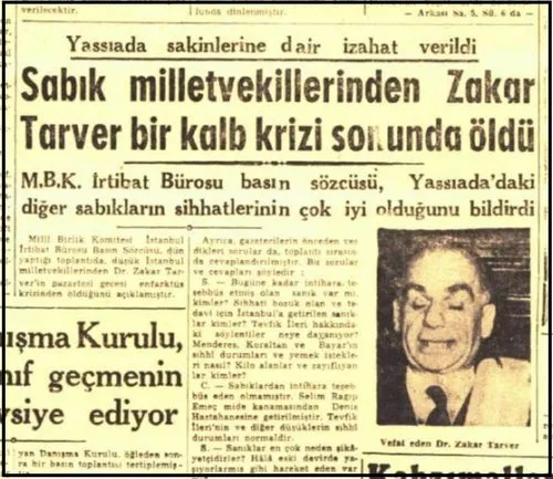 İlk günden itibaren 27 Mayıs darbesine destek veren Cumhuriyet Gazetesi 20 Eylül 1960 tarihli sayısında işkence ile ölümü "Sabık milletvekillerinden Zakar Tarver bir kalp krizi sonucu öldü" başlığı ile verdi. Gazete, kara propagandayı şu cümlelerle sürdürüyordu: MBK Basın Sözcüsü, Yassıada'daki diğer sabıkların sıhhatlerinin çok iyi olduğunu bildirdi.