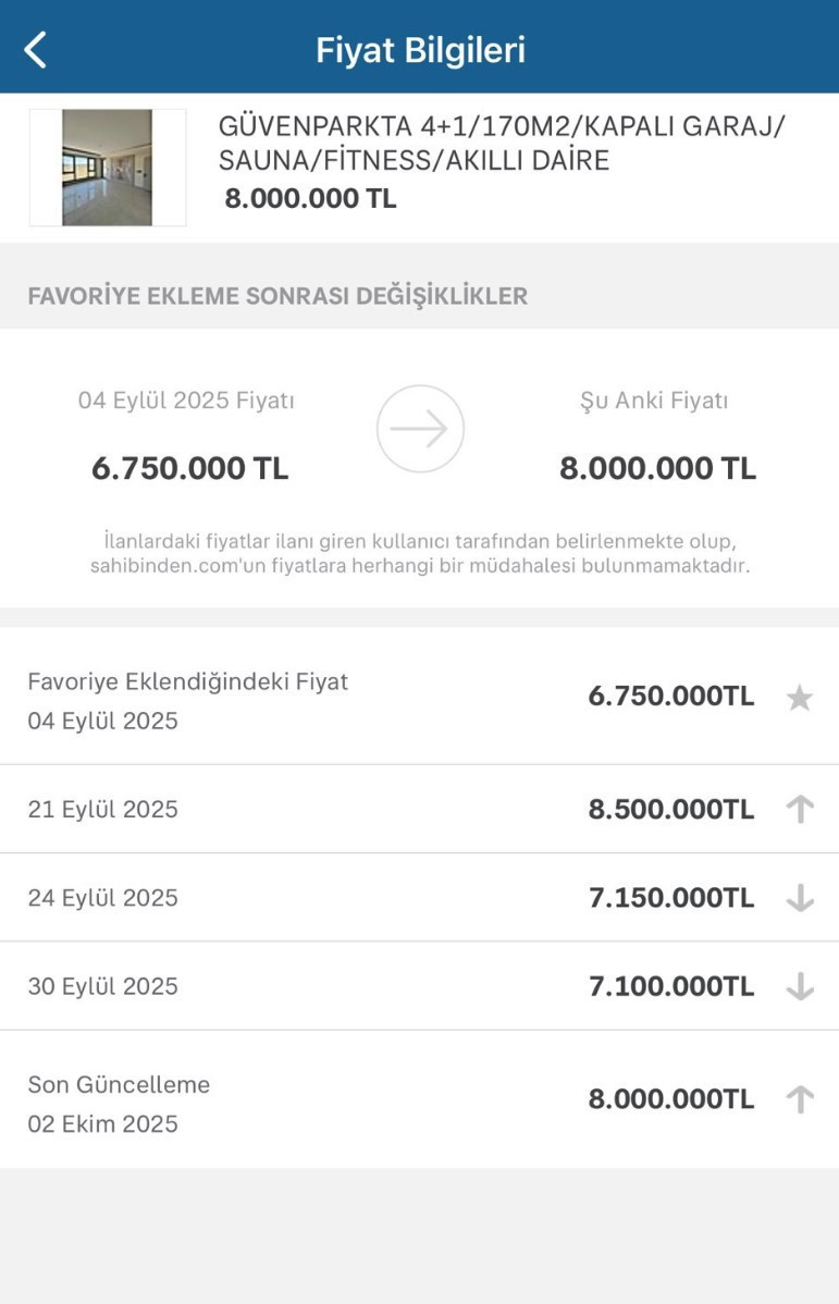 İlan sitesi üzerinden yayımlanan bir konut satış ilanında, 1 Eylül 2025 tarihinde 6 milyon 750 bin TL olarak verilen fiyat, yaklaşık bir ay içinde 2 Ekim 2025 tarihinde 8 milyon TL olarak güncellendi.