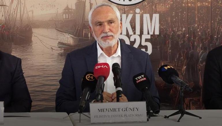 Mehmet Güney, "Bundan sonra 7 Ekim 2023 de başlayan bu kıyam bugün itibariyle bu gün itibariyle iki yılını doldurdu ve bizde Filistin Destek Platformunun paydaşları olarak bu kardeşlerimizin direnişlerine sahip çıkalım diye inşallah 5 Ekim Pazar günü Ayasofya Camii Meydanı'ndan başlayıp saat 13:00’da Ayasofya Meydanından başlayıp Eminönü Meydanı'na kadar yürüyeceğiz ve burada ayak seslerimiz Tel Aviv’den duyulsun istiyoruz. Burada kardeşlerimize verdiğimiz destekte aynı zaman da kassam tugaylarının yüreğinde de hissedilsin istiyoruz. Aynı zamanda deniz vasıtalarıyla birlikte gerek haliç tarafından gerek boğazdan gelen deniz vasıtalarıyla birlikte Eminönü’nde hem Sumud filosunu anımsatabilecek deniz vasıtalarımız hem de karadan yürüyüşümüzle birlikte Eminönü meydanında inşallah 5 Ekim 2025 itibariyle saat 13:00’dan sonra ben tüm İstanbul’daki kardeşlerimizi bu kutlu eyleme davet etmek istiyorum. Bu eylem sadece İstanbul ile sınırlı kalmayacak İstanbul’un yanı sıra Ankara başta olmak üzere aynı gün Türkiye’nin 81 ilinde kardeşlerimiz basın toplantılarıyla yürüyüşlerle eylemlerle dualarla değişik etkinliklerle birlikte bunun anısına inşallah bu hayırlı hizmetlerini yapacaklar. 5 Ekim Pazar günü herkes bulunduğu ilde inşallah bu duyarlılığın paydaşı olsun" dedi.