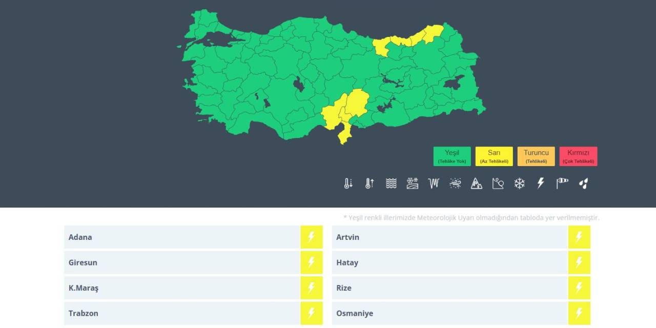 Geçtiğimiz haftalarda Trabzon, Rize, Giresun ve Artvin'de sel ve su baskınlarına neden olan yağışlı ve fırtınalı hava bu kez daha şiddetli geliyor. Meteoroloji Adana, Artvin, Giresun, Hatay, Kahramanmaraş, Rize, Trabzon ve Osmaniye için sarı kodla uyarı verdi.