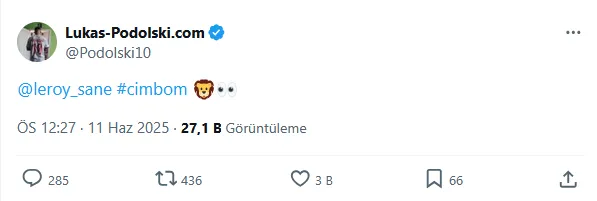 Paylaşımında Leroy Sane'yi etiketleyen Podolski, aslan emojisi ekledi ve "Cimbom" yazdı.