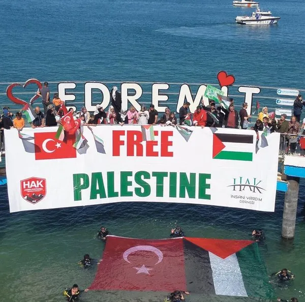 ❱ VAN: Sumud Filosu'na destek amacıyla bir araya gelenler, tekne ve kanolarla Van Gölü'ne açıldı, dalgıçlar da göle dalarak Türk ve Filistin bayrakları açtı. HAK İnsani Yardım Derneği öncülüğünde, birçok kurum ve sivil toplum kuruluşunun desteğiyle Edremit ilçesinde Van Gölü kıyısındaki Kent Meydanı'nda bir araya gelen vatandaşlar, İsrail aleyhine slogan attı. Kur'an-ı Kerim tilavetinin ardından dua edilen programda konuşan derneğin il temsilcisi Tekin Üzümcü, zorlu şartlara rağmen dimdik ayakta duran, onurunu asla teslim etmeyen kahraman Gazze halkının yanında olduklarını söyledi.