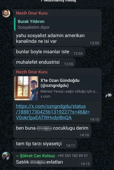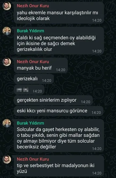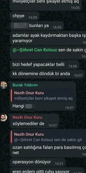 Siyaset Bilimci Nezih Onur Kuru, Burak Yıldırım ve Şöhret Can Kolsuz'un yer aldığı gruptaki mesajlaşmalarda, özellikle İmamoğlu'na yakın ve CHP Gençlik Kolları Başkanlığı için de oynayan Şöhret Can Kolsuz'un Mansur Yavaş'a yönelik, "CHP savaşın varlığını kabul edip Mansur'u s....r etmezse CHP tabanını böler. Anadolu'da siyaset yapıyorum ve bunu görüyorum. Mansur hem CHP'li hem değil. Ona oy verme hissi ihanet etmiş duygusu uyandırmayacak seçmende. Bugünden kabul edip saldırı olmazsa Mansur %10 almayacak. %25-30'la başlayacak maça..." sözleri dikkat çekiyor.