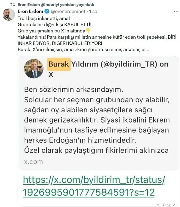 Eren Erdem sosyal medya hesabından paylaştığı mesajında, "Troll başı inkar etti, ama! Gruptaki bir diğer kişi kabul etti, Yakalandınız! Para karşılığı milletin annesine küfür eden troll şebekesi, biri inkar ediyor, diğeri kabul ediyor. Burak, X'ini silmişsin, ama ekran görüntüsü almış arkadaşlar…" ifadelerini kullandı.