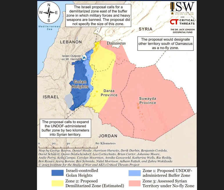 Amerikan Savaş Araştırmaları Enstitüsü ve Amerikan Girişim Enstitüsü tarafından yayınlanan ve İsrail'in Suriye'ye yönelik uzun vadeli stratejik planlarını özetleyen harita, Siyonist rejimin karanlık planlarına ışık tutuyor. Haritadaki detaylar, İsrail'in yalnızca askeri hedefleri değil, aynı zamanda Suriye'nin demografik ve siyasi yapısını yeniden şekillendirmeye yönelik kapsamlı planlarını da gözler önüne seriyor. Haritadaki detaylar, Suriye'nin sınır komşusu Türkiye için ağır güvenlik ve stratejik riskler taşıyor. Harita aynı zamanda Golan ve Güney Suriye üzerinden doğuya doğru uzanan bir hat ve bu hattın Deyrizor eksenine kadar bağlanabilecek stratejik bir “koridor” niyetini açıkça gösteriyor.