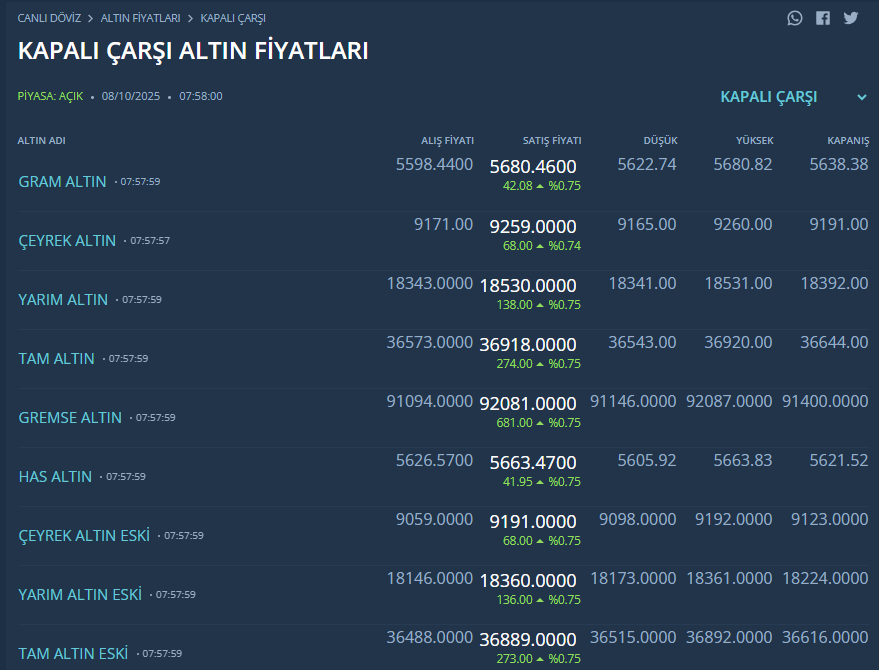 Kapalıçarşı'da altı fiyatları arasındaki makas devam ediyor. Gram altın Kapalıçarşı'da 5 bin 680 lirada bulunuyor. Resmi rakamlara aradaki fark 271 lira oldu. İşte Kapalıçarşı altın fiyatları