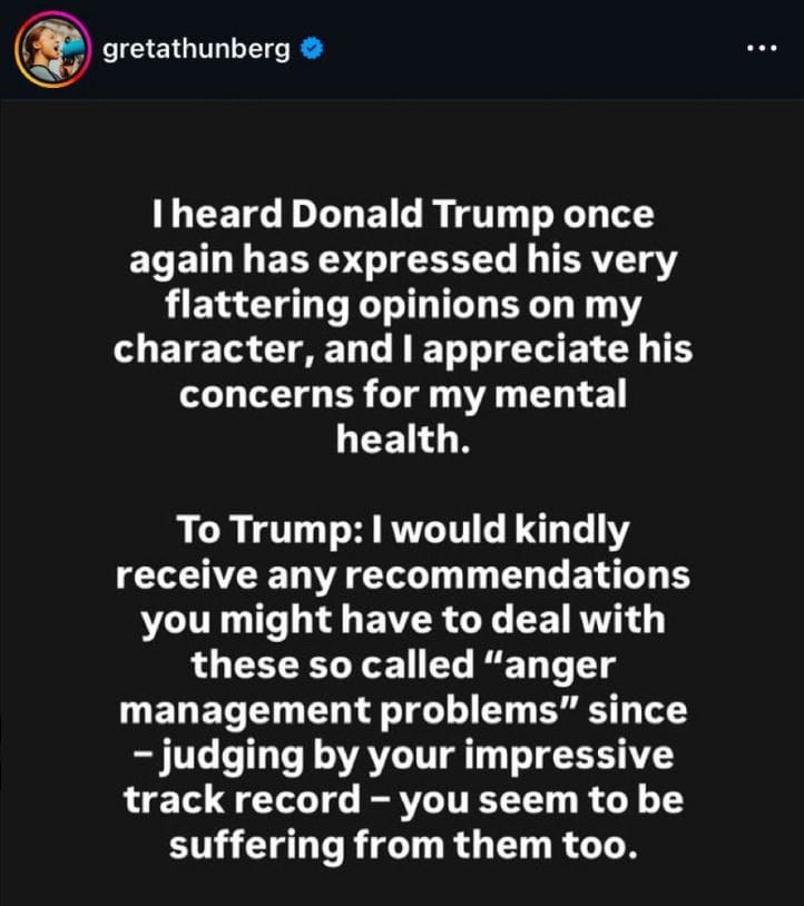 İsrail'de gözaltına alındıktan sonra Yunanistan'a sınır dışı edilen Thunberg, sosyal medya hesabından yaptığı paylaşımla Trump'a şöyle yanıt verdi: