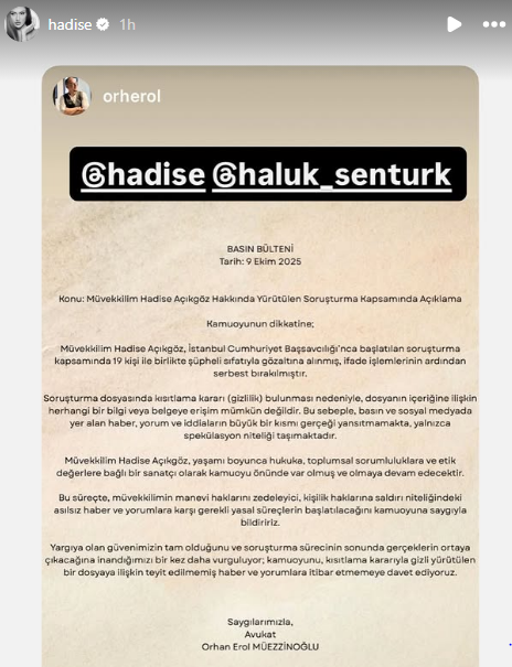 "Müvekkilim Hadise Açıkgöz, İstanbul Cumhuriyet Başsavcılığı'nca başlatılan soruşturma kapsamında 19 kişi ile birlikte şüpheli sıfatıyla gözaltına alınmış, ifade işlemlerinin ardından serbest bırakılmıştır.