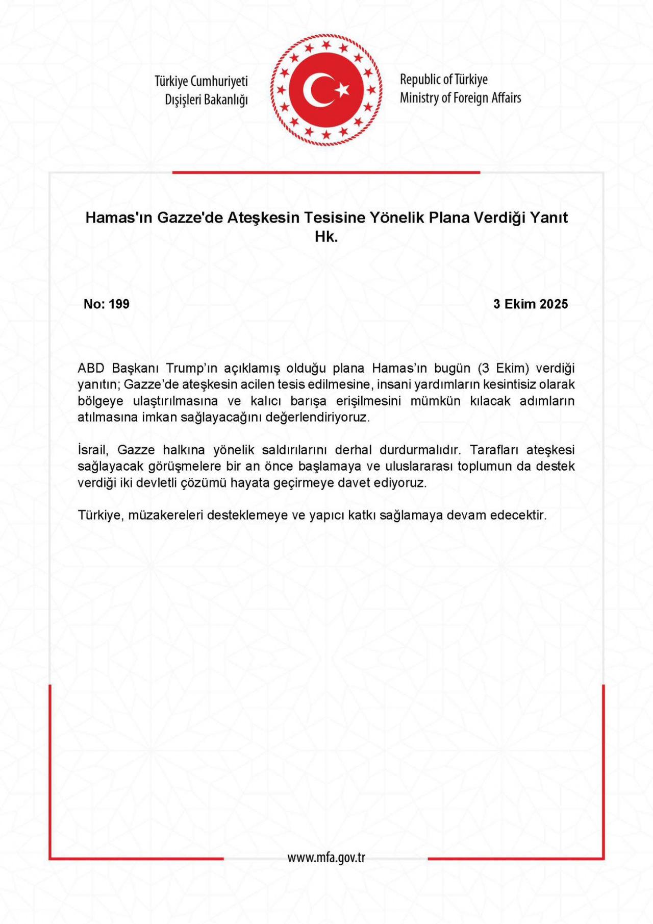 Dışişleri Bakanlığından yapılan yazılı açıklamada, "ABD Başkanı Trump’ın açıklamış olduğu plana Hamas’ın bugün (3 Ekim) verdiği yanıtın; Gazze’de ateşkesin acilen tesis edilmesine, insani yardımların kesintisiz olarak bölgeye ulaştırılmasına ve kalıcı barışa erişilmesini mümkün kılacak adımların atılmasına imkan sağlayacağını değerlendiriyoruz" denildi.