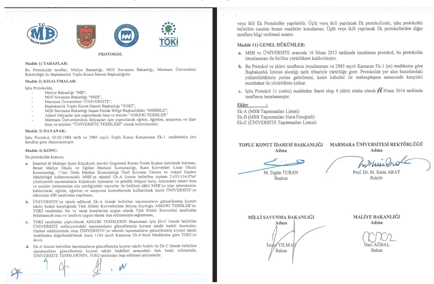 İşte bu milyar dolar değerindeki rant kaynağı önce bir protokol ile üniversitenin elinden alındı. Marmara Üniversitesi Rektörlüğü, Maliye Bakanlığı, Milli Savunma Bakanlığı ve TOKi arasında 2016 yılında imzalandı. O dönem 15 Temmuz darbe kalkışmasının yaşandığı karışık günler, DAP Yapı’ya bu rantı vermek için fırsat görüldü. Çünkü şehir merkezindeki askeri alanlar Emlak GYO ve TOKİ’ye devredilmeye başlandı.
