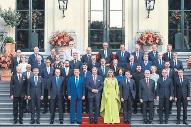 Yemeğe gelen konukları karşılayan Hollanda Kralı Willem-Alexander ve eşi Maxima'nın, zirveye katılan devlet ve hükümet başkanları ve eşleriyle fotoğraf çektirmesinin ardından yemeğe geçildi. Yemekte, Başkan Erdoğan ile ABD Başkanı Trump, Çekya Cumhurbaşkanı Petr Pavel, İtalya Başbakanı Giorgia Meloni ve NATO Genel Sekreteri Mark Rutte aynı masada oturdu. Bu arada Cumhurbaşkanı Erdoğan, yemek öncesi aile fotoğrafı çekiminde solunda bulunan ABD Başkanı Trump ile tokalaştı.