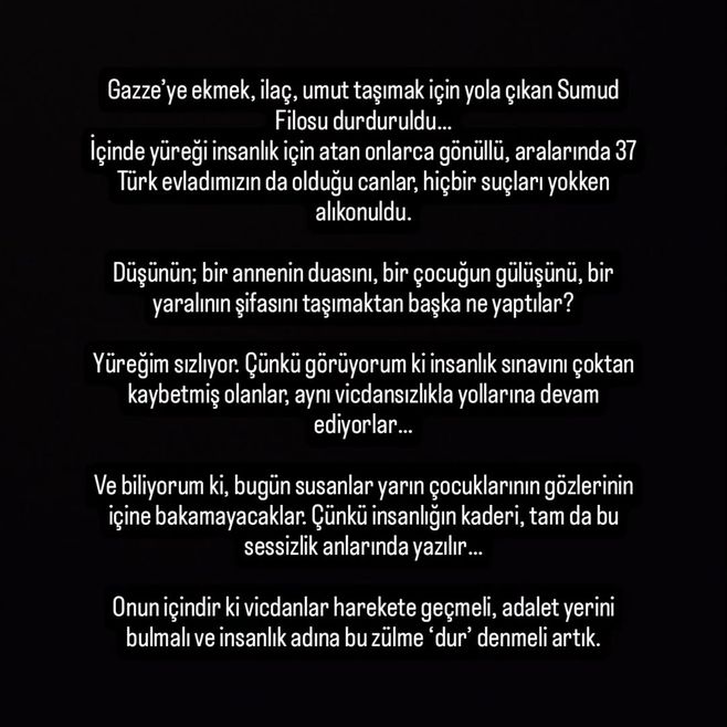 "Gazze'ye ekmek, ilaç, umut taşımak için yola çıkan Sumud Filosu durduruldu. İçinde yüreği insanlık için atan onlarca gönüllü, aralarında 37 Türk evladımızın da olduğu canlar, hiçbir suçları yokken alıkonuldu. Düşünün, bir annenin duasını, bir çocuğun gülüşünü, bir yaralının şifasını taşımaktan başka ne yaptılar? Yüreğim sızlıyor. Çünkü görüyorum ki insanlık sınavını çoktan kaybetmiş olanlar, aynı vicdansızlıkla yollarına devam ediyorlar.