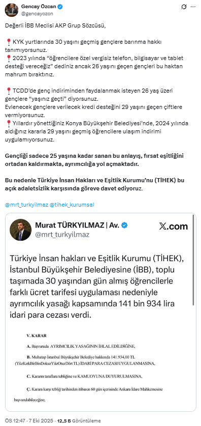 Cumhurbaşkanlığı İletişim Başkanlığı eski Başkanı Fahrettin Altun'un atandığı Türkiye İnsan hakları ve Eşitlik Kurumu (TİHEK), İstanbul Büyükşehir Belediyesi'ne (İBB) toplu taşımada 30 yaşından gün almış öğrencilerle farklı ücret tarifesi uygulaması nedeniyle ayrımcılık yasağı kapsamında 141 bin 934 lira para cezası uyguladı.