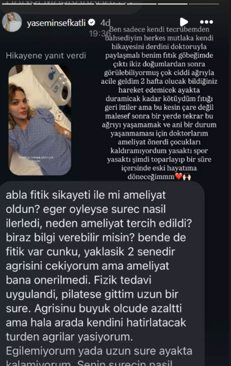 Yasemin Şefkatli, yaşadığı süreci şu sözlerle aktardı; "Ben sadece kendi tecrübemden bahsedeyim; herkes mutlaka hikayesini ve derdini doktoruyla paylaşmalı. Benim fıtığım göbeğimde çıktı, ikiz doğumlardan sonra görülebiliyormuş. Çok ciddi ağrıyla acile geldim; iki haftadır neredeyse hareket edemeyecek, ayakta duramayacak kadar kötüydüm. Fıtığı geri ittiler ama bu kesin bir çare değil maalesef. Sonrasında tekrar bu ağrıyı yaşamamak ve ani bir durumla karşılaşmamak için doktorlarım ameliyat önerdi. Çocukları kaldıramıyordum, spor yasaktı. Şimdi toparlayıp, bir süre içinde eski hayatıma döneceğim."