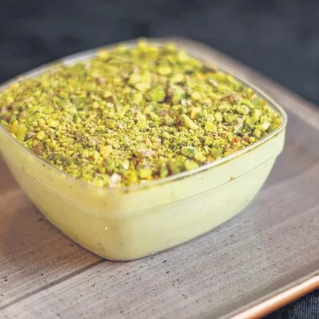 YAPILIŞI: Bir tencerede süt, şeker ve vanilya karıştırarak pişiriyoruz. Kaynadığı zaman ocaktan alıyoruz. Başka bir tencerede tereyağını eritiyoruz, irmik ve fıstığı ekleyip renkleri hafif koyulaşana kadar kavuruyoruz. Daha sonra rengi koyulaşan irmikli harca süt karışımını yavaş yavaş ekliyoruz. Tencerenin kapağını kapatarak süt karışımı çekene kadar pişiriyoruz.