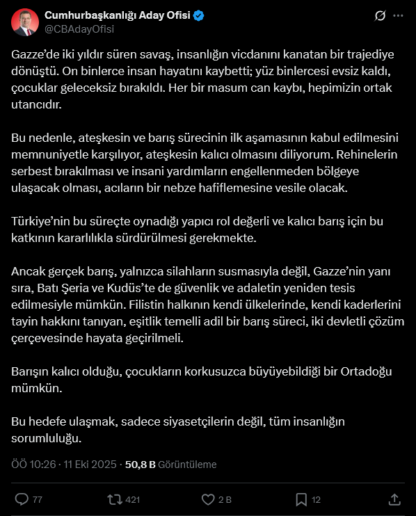 “Ancak gerçek barış, yalnızca silahların susmasıyla değil, Gazze’nin yanı sıra, Batı Şeria ve Kudüs’te de güvenlik ve adaletin yeniden tesis edilmesiyle mümkün. Filistin halkının kendi ülkelerinde, kendi kaderlerini tayin hakkını tanıyan, eşitlik temelli adil bir barış süreci, iki devletli çözüm çerçevesinde hayata geçirilmeli.”