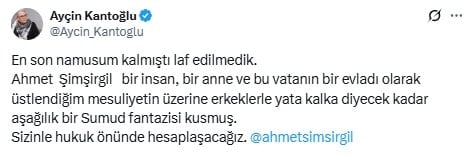 "En son namusum kalmıştı laf edilmedik. Ahmet Şimşirgil bir insan, bir anne ve bu vatanın bir evladı olarak üstlendiğim mesuliyetin üzerine erkeklerle yata kalka diyecek kadar aşağılık bir Sumud fantazisi kusmuş. Sizinle hukuk önünde hesaplaşacağız."