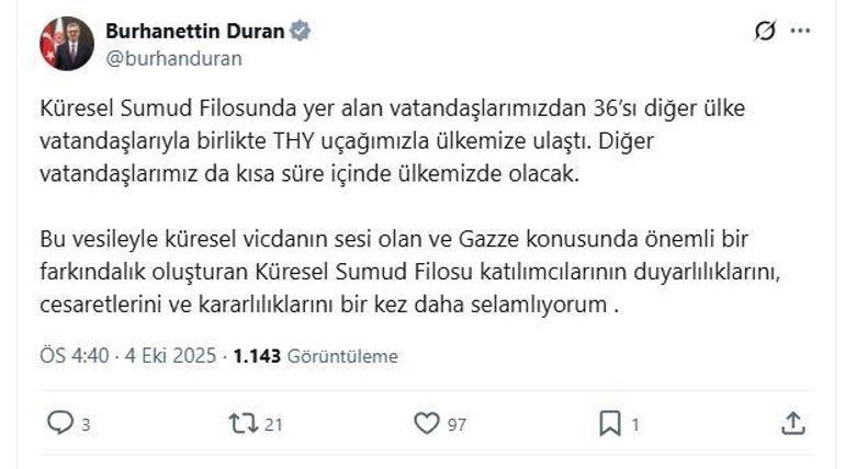 İletişim Başkanı Burhanettin Duran, sosyal medya hesabından yaptığı paylaşımda, "Küresel Sumud Filosunda yer alan vatandaşlarımızdan 36’sı diğer ülke vatandaşlarıyla birlikte THY uçağımızla ülkemize ulaştı. Diğer vatandaşlarımız da kısa süre içinde ülkemizde olacak. Bu vesileyle küresel vicdanın sesi olan ve Gazze konusunda önemli bir farkındalık oluşturan Küresel Sumud Filosu katılımcılarının duyarlılıklarını, cesaretlerini ve kararlılıklarını bir kez daha selamlıyorum" ifadelerini kullandı.