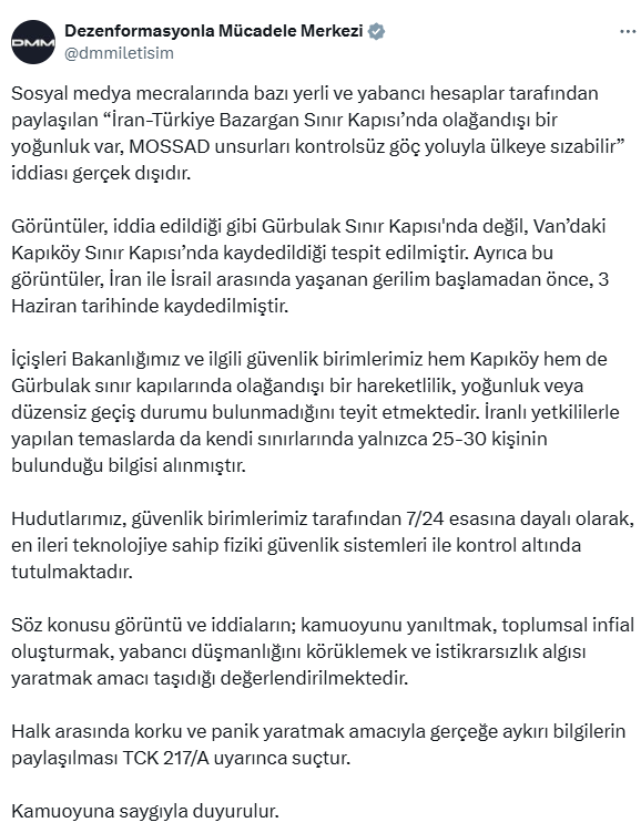 İletişim Başkanlığı, bazı yerli ve yabancı hesaplar tarafından paylaşılan "İran-Türkiye Bazargan Sınır Kapısı'nda olağandışı bir yoğunluk var, MOSSAD unsurları kontrolsüz göç yoluyla ülkeye sızabilir" iddiasının gerçek dışı olduğunu duyurdu.