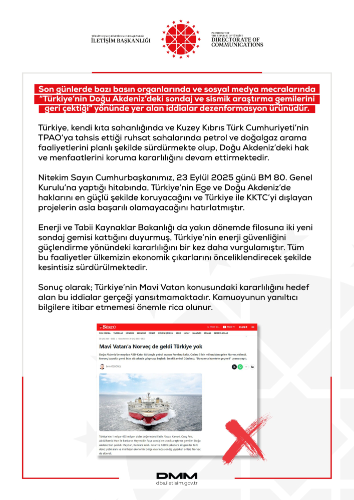 Enerji ve Tabii Kaynaklar Bakanlığı da yakın dönemde filosuna iki yeni sondaj gemisi kattığını duyurmuş, Türkiye'nin enerji güvenliğini güçlendirme yönündeki kararlılığını bir kez daha vurgulamıştır. Tüm bu faaliyetler ülkemizin ekonomik çıkarlarını önceliklendirecek şekilde kesintisiz sürdürülmektedir. Sonuç olarak Türkiye'nin 'Mavi Vatan' konusundaki kararlılığını hedef alan bu iddialar gerçeği yansıtmamaktadır. Kamuoyunun yanıltıcı bilgilere itibar etmemesi önemle rica olunur."