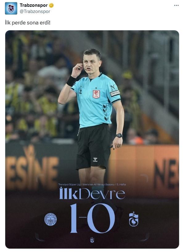 TRABZONSPOR'DAN HAKEM TEPKİSİTrabzonspor, Fenerbahçe maçının ilk yarısının sona ermesinin ardından hakem Ozan Ergün'e tepki gösterdi. Karadeniz ekibi, ilk devrenin bitimiyle birlikte hakem Ozan Ergün'ün fotoğrafını sosyal medya hesaplarıdnan paylaştı.