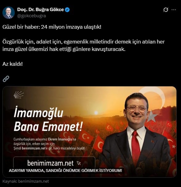"Güzel bir haber: 24 milyon imzaya ulaştık! Özgürlük için, adalet için, egemenlik milletindir demek için atılan her imza güzel ülkemizi hak ettiği günlere kavuşturacak. Az kaldı!"