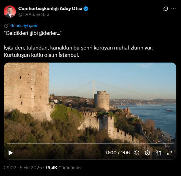 Cumhurbaşkanlığı Aday Ofisi’nden yapılan paylaşımda İmamoğlu, Gazi Mustafa Kemal Atatürk’ün “Geldikleri gibi giderler” sözlerine yer verdi.