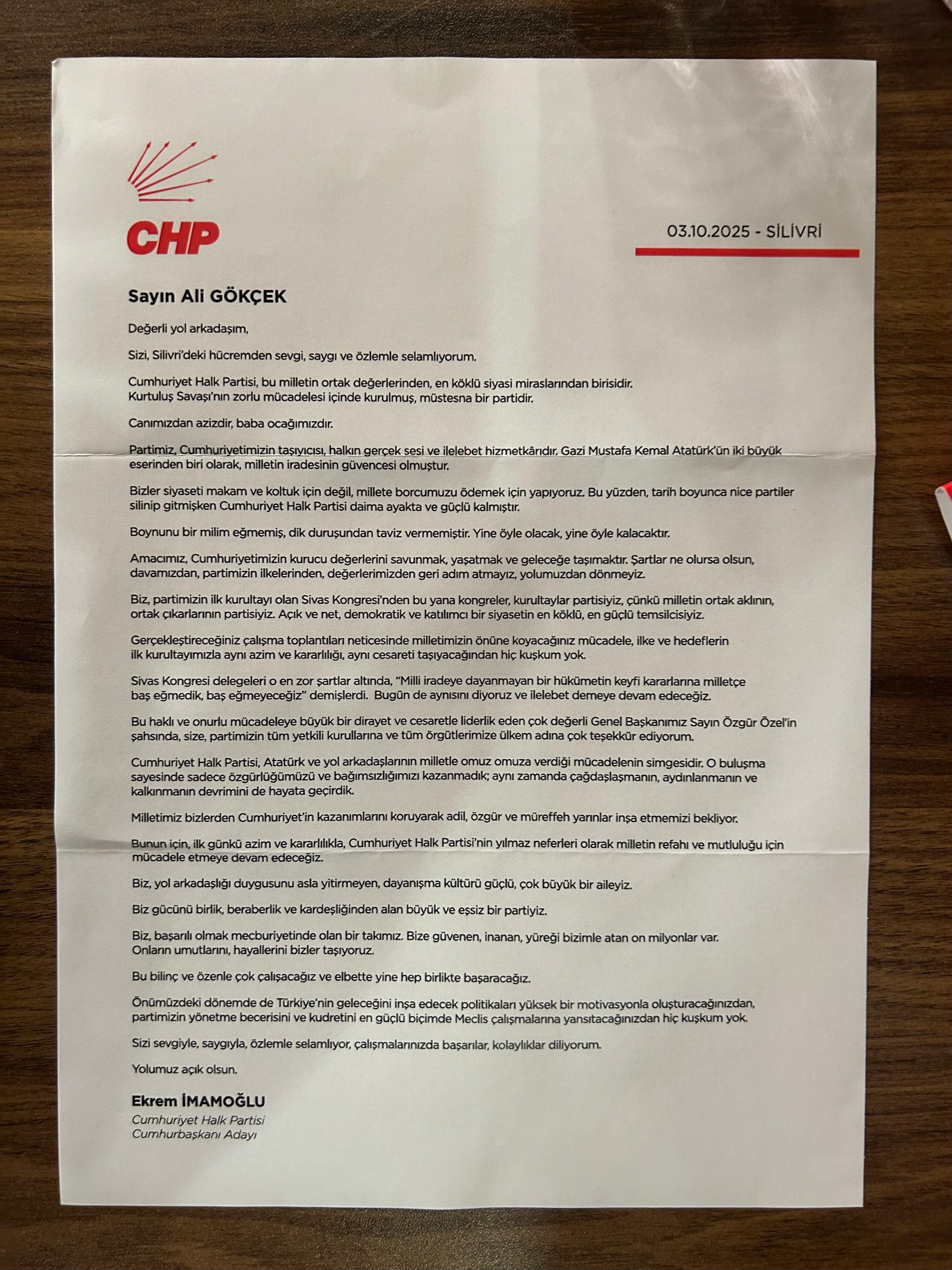 İstanbul Büyükşehir Belediyesine yönelik yapılan operasyonlarda tutuklanan ve Silivri'deki Marmara Cezevinde tutuklu bulunan İstanbul Belediye Başkanı ve CHP'nin Cumhurbaşkanı Adayı Ekrem İmamoğlu, CHP'nin bu yıl üçüncüsü düzenlenen ve her yasama yılının başında yaptığı milletvekili kampına bir mektup gönderdi.
