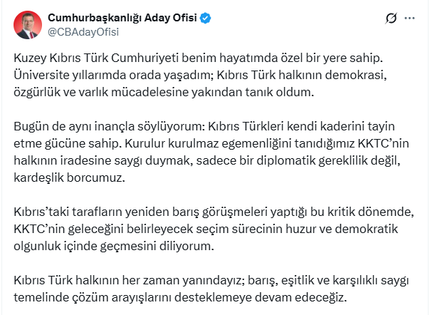 İmamoğlu'nun KKTC'deki seçimlere dair paylaştığı mesaj şu şekilde oldu: