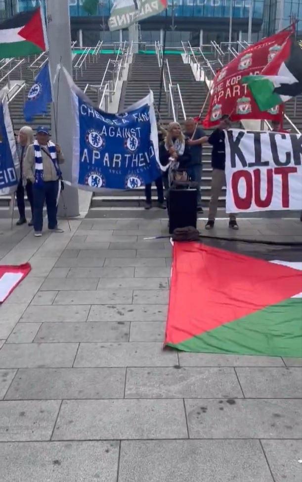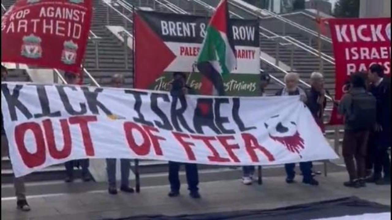 İngiltere'nin başkenti Londra'daki Wembley Stadı önünde toplanan grup, "İsrail'i FIFA'dan atın", "Filistin'e adalet", "İsrail'i boykot edin", "Yaşasın özgür Filistin" sloganları atarak Filistin bayraklarıyla yürüyüş gerçekleştirdi. Protestocular, İngiltere Futbol Federasyonu'na, İsrail'in UEFA ve FIFA tarafından men edilmesine destek vermesi çağrısında bulundu.