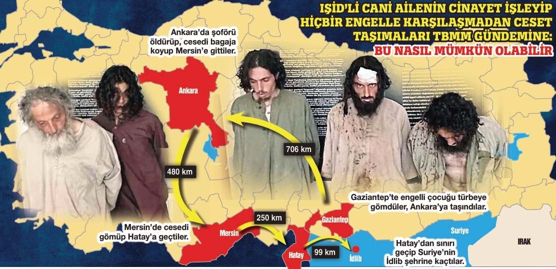 ‘HANİ KUŞ UÇMUYORDU’14 kişi, 250 kilometre daha gidip trafik ve asayiş kontrolüne takılmadan 250 kilometre uzaklıktaki Hatay’a ulaştı. Buradan sınırı yasa dışı yollarla geçen katiller, cihatçıların merkezi olan 99 km uzaklıktaki İdlip Atme bölgesine kaçtı. Aileden 8 kişi ölü ele geçirildi, 6’sı ise yakalanıp getirildi. Katillerin 829 kilometre boyunca hiçbir polis-jandarma kontrolüne takılmadan elini kolunu sallaya sallaya gezmesine tepki yağdı.