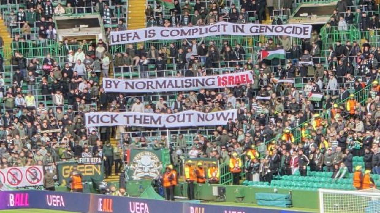 Celticli taraftarların açtıkları pankartlarda "UEFA, israil'i normalleştirerek soykırıma ortak oluyor." ve "Onları hemen atın." mesajları yer aldı.