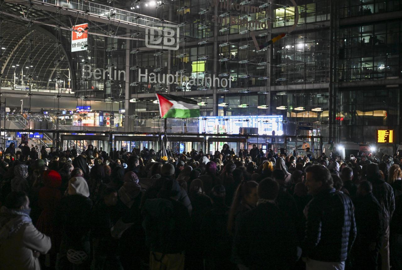 Berlin ana tren istasyonunda toplanan yaklaşık 300 kişi, Küresel Sumud Filosu ile dayanışma mesajları verdi.